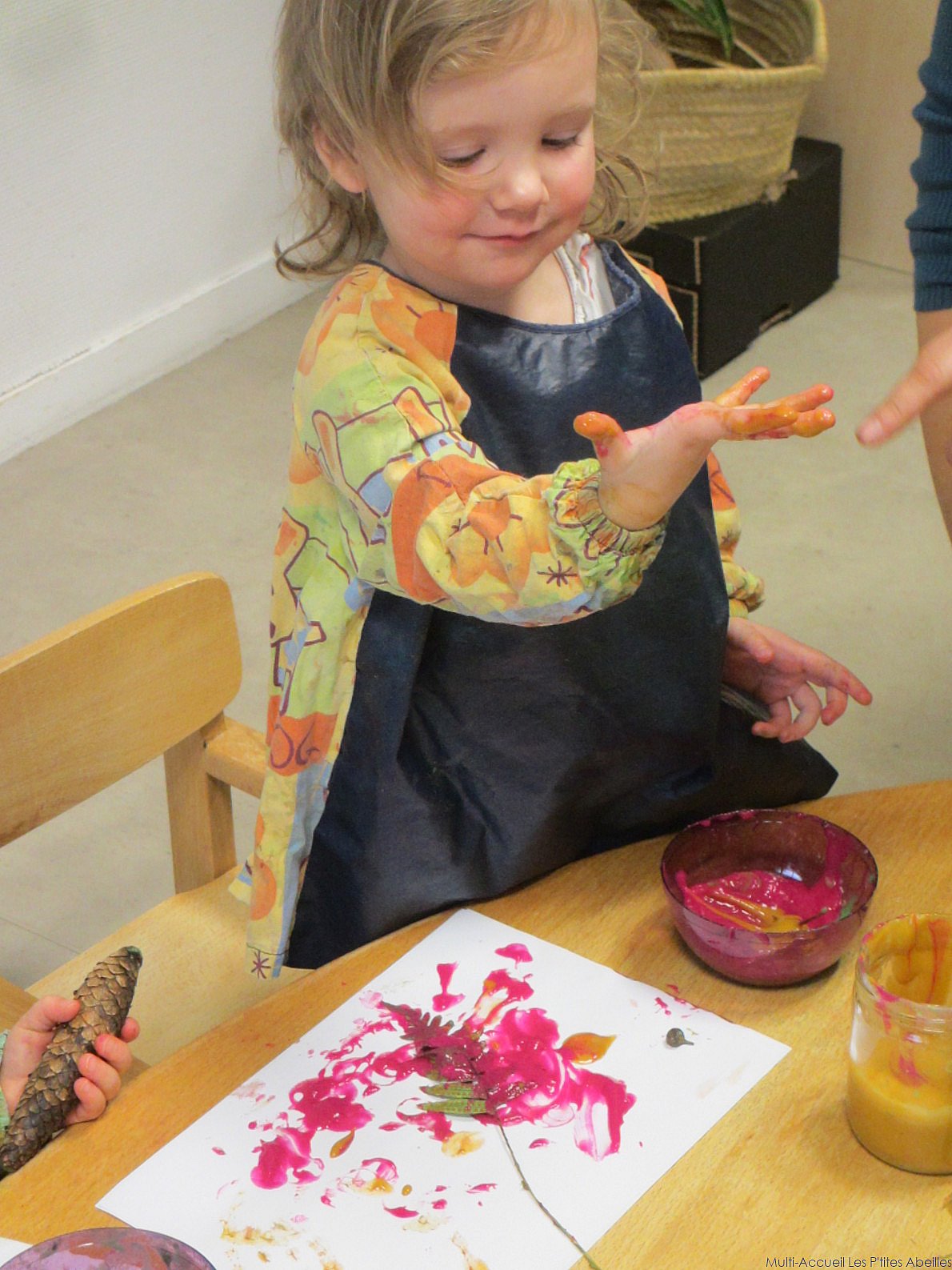 A l’occasion de nos ateliers potager, Marianne et Elisabeth de l’association Optim’ism sont venues les bras chargés de bocaux colorés et de végétations. Les enfants ont manipulé de la peinture végétale, réalisée en amont avec de la purée de pommes de terre et des colorants naturels. Ils ont pris beaucoup de plaisir à découvrir cette matière douce aux couleurs vives.