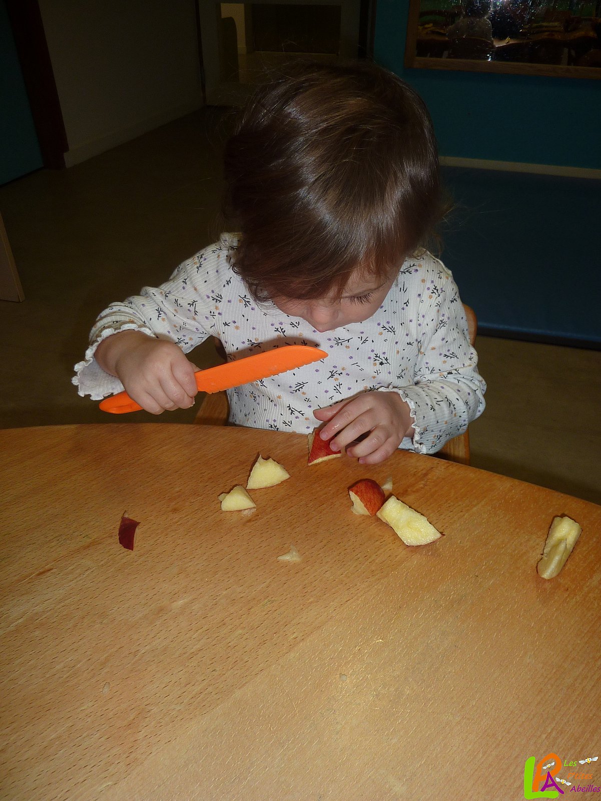 Ensuite, l’adulte a coupé la pomme en deux et les enfants ont pu à leur tour couper des quartiers de différentes tailles avec des couteaux adaptés : des gros morceaux et réguliers pour certains, plus fins pour d’autres.