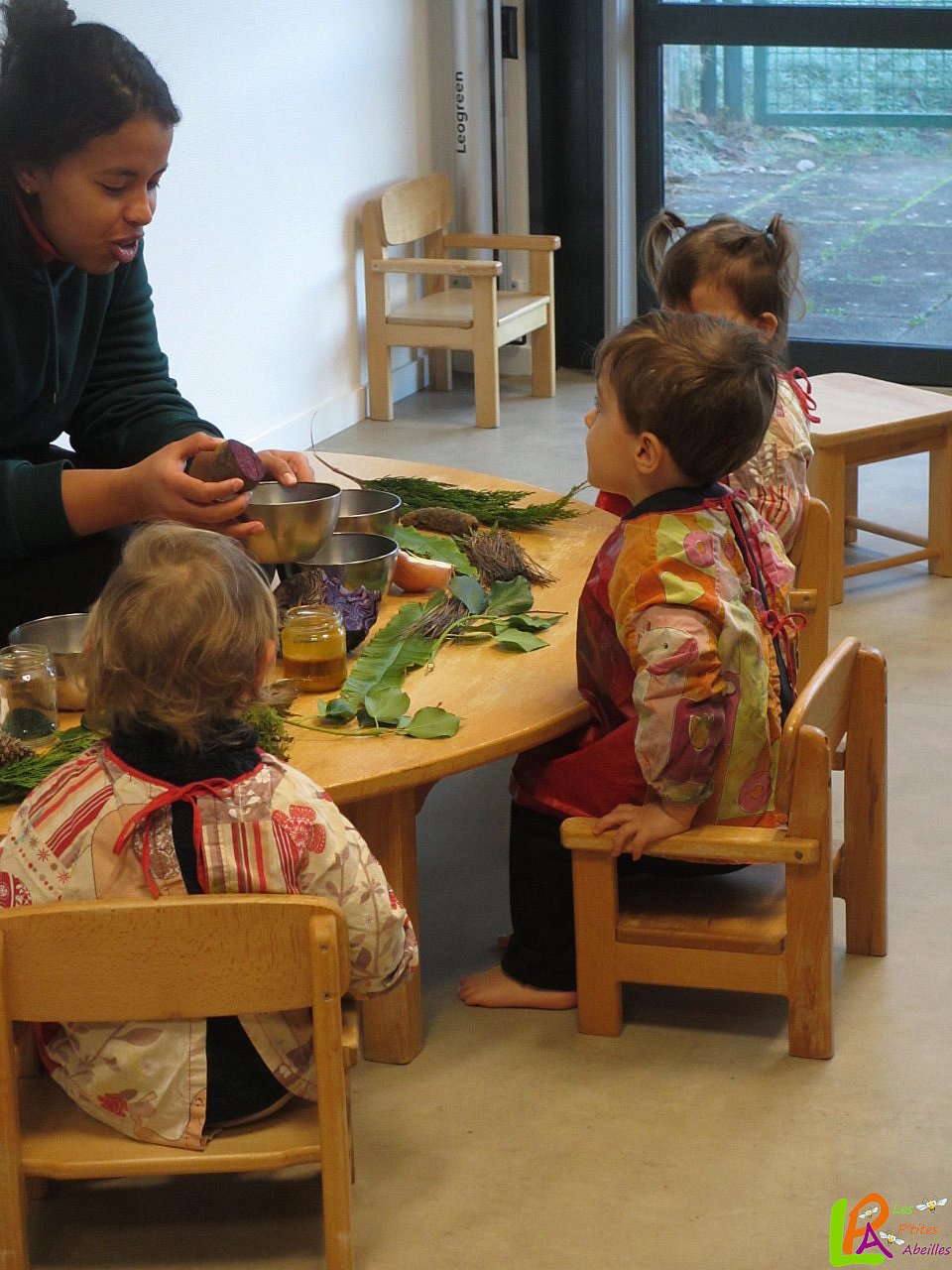 Une deuxième proposition consistait à créer de la pâte à modeler colorée en mélangeant de l’encre végétale avec de la farine et de la maïzena. Les enfants ont aimé réaliser et manipuler cette matière.